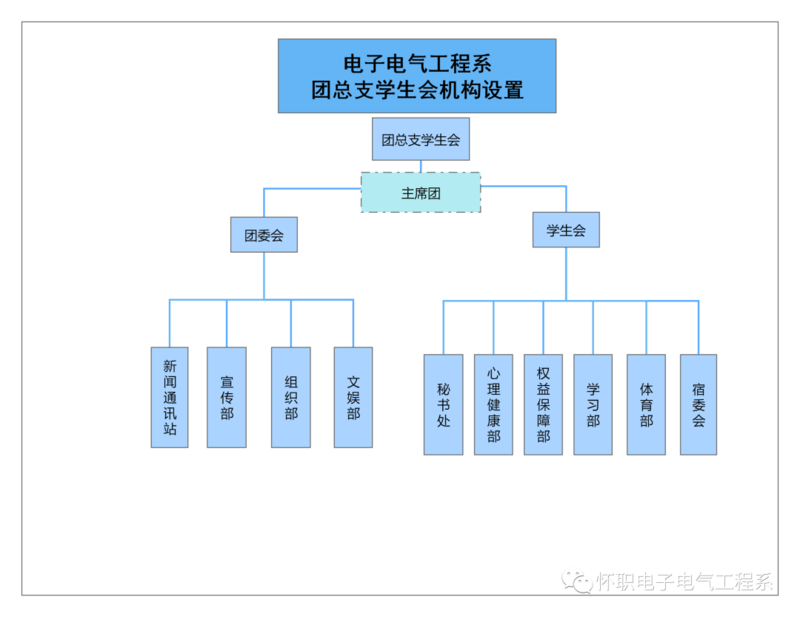 电子电气工程系团总支学生会主要由主席团、秘书处、组织部、文娱部、宣传部、通讯站、心理健康部、权益保障部、体育部、学习部、宿委会等部门组成。