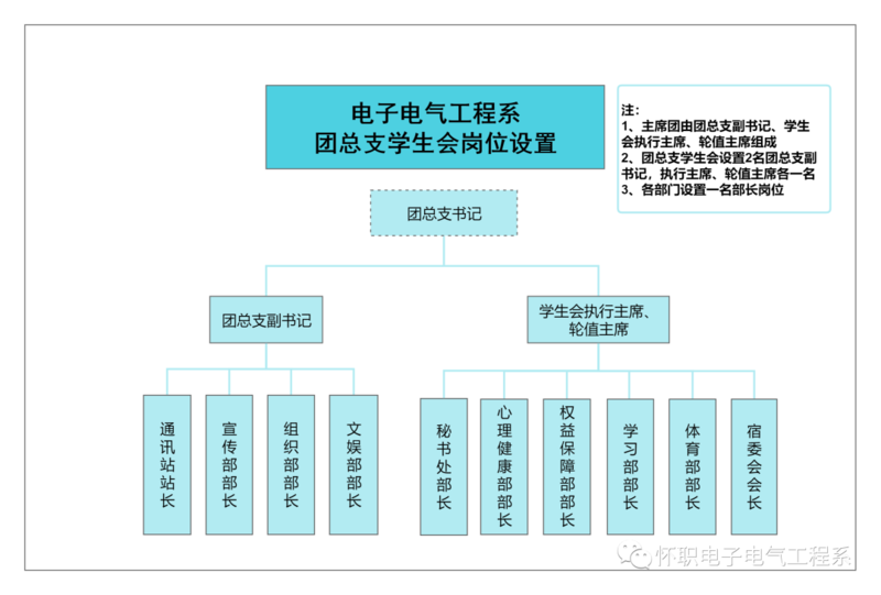 电子电气工程系团总支学生会设置两名团总支副书记、学生会执行主席、轮值主席、各部门部长各一名,各部门干事若干名等岗位。
