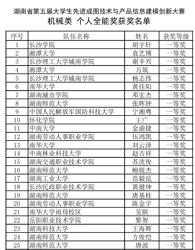 2025年 5月 23日至 25日,由湖南省图学学会主办、中南大学承办的"湖南省第五届大学生先进成图技术与产品信息建模创新大赛"暨"第十八届全国大学生先进成图技术与产品信息建模创新大赛"预选赛在中南大学圆满落幕。我院2023级机械制造与自动化专业 4班朱景斌同学,在黄贤叶页老师、钦宇老师的悉心指导下,凭借扎实的专业功底荣获机械类个人全能三等奖,成功获得推荐参加7月份举办的全国大赛资格。